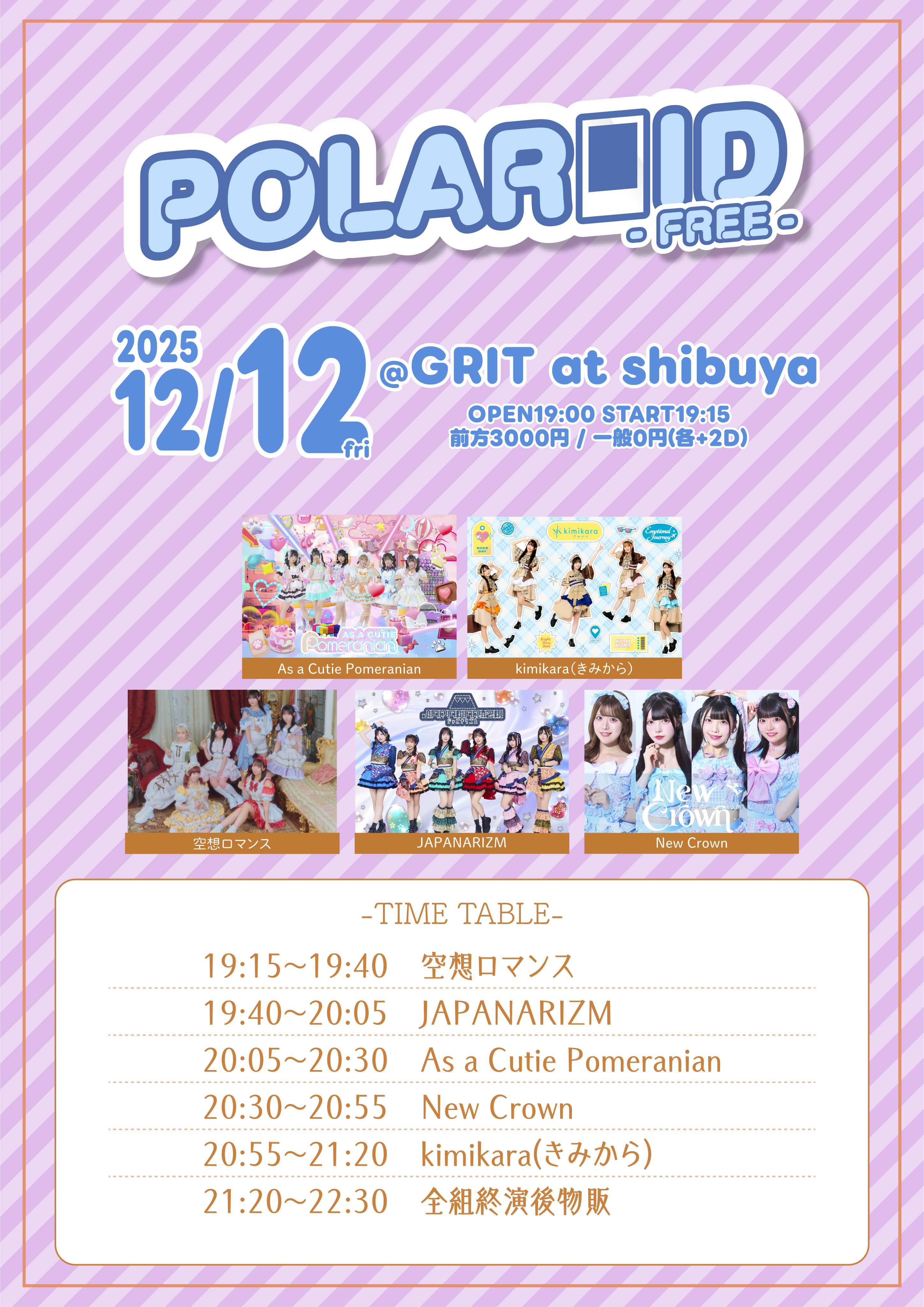 出演者 As a Cutie Pomeranian kimikara(きみから) 空想ロマンス JAPANARIZM New Crown OPEN 19:00 / START 19:15 ADV 前方¥3,000 一般¥0(+2drinkcharge¥1,200) アイドル